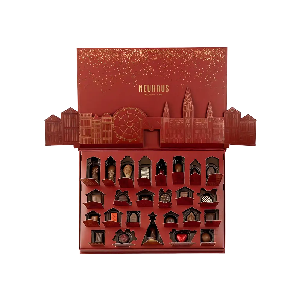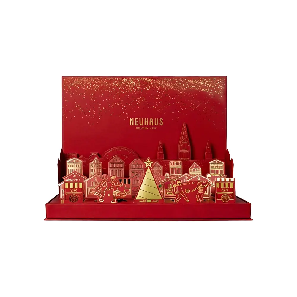 The Starmi Architectural Series is engineered to transform seasonal packaging into a brand landmark. This bespoke advent calendar features a vibrant crimson finish, serving as a stage for a multi-layered 3D pop-up cityscape. By merging structural engineering with festive storytelling, we provide a theatrical unboxing experience that increases customer retention and brand social sharing by up to 40%.