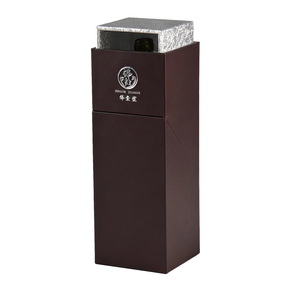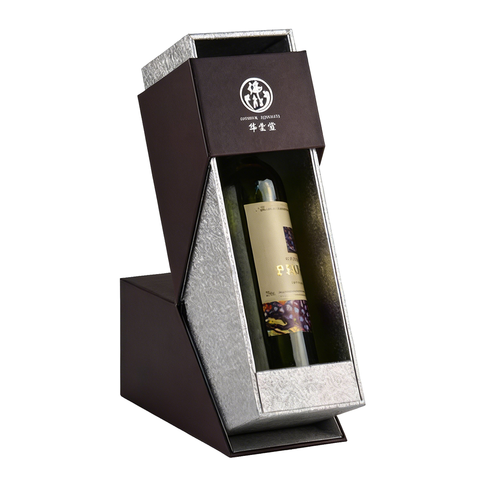 The standout feature is the unique angular tilting mechanism. When opened, the box transforms into a dynamic display stand, presenting the wine at an inviting angle that signals prestige and exclusivity. We utilize heavy-duty rigid board and precision-engineered hinges to ensure structural integrity and a smooth, controlled unboxing experience. The silver foil-stamped logo on the exterior adds a final touch of bespoke craftsmanship, ensuring your brand leaves a lasting impression.