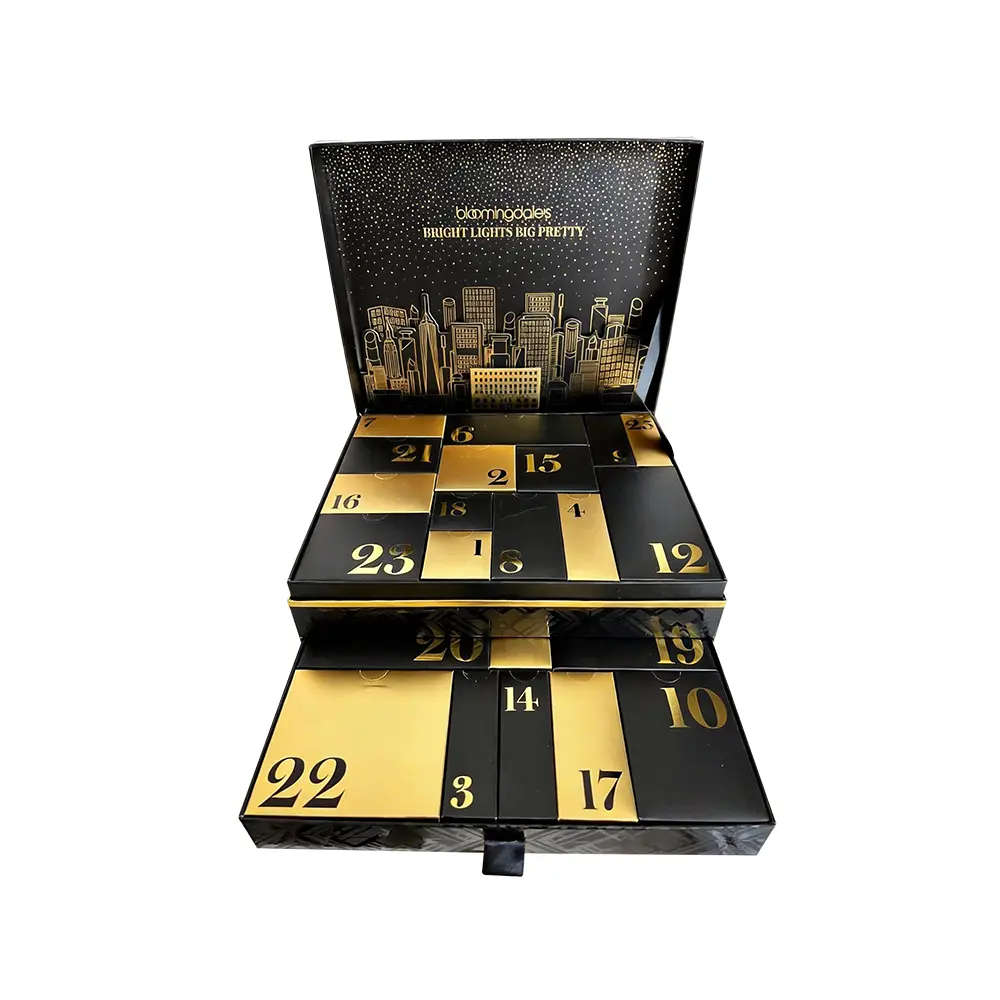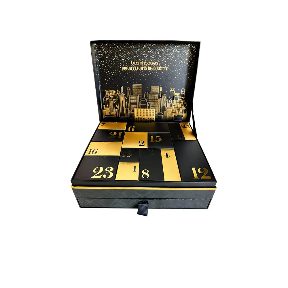 First impressions define the holiday spirit. Our bespoke beauty advent calendar is designed to transform the traditional countdown into a premium sensory journey. Inspired by the "Bright Lights" of the city, this box features a shimmering gold foil skyline set against a deep matte black canvas, acting as a stunning brand ambassador for high-end cosmetic collections.