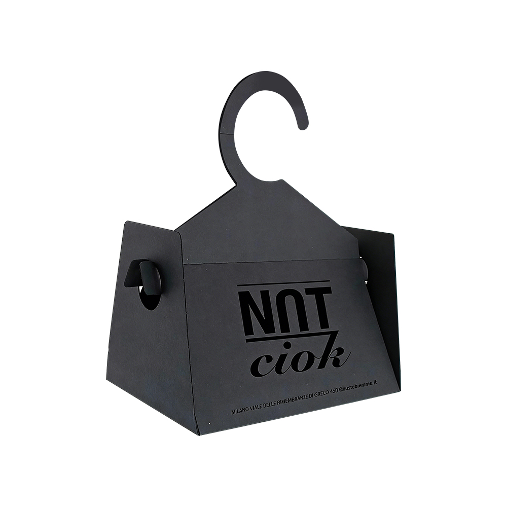 Packaging is no longer just a container; it is a versatile display solution. Our bespoke hanging gift bag is engineered for brands that demand space-saving efficiency without compromising on avant-garde aesthetics. The deep charcoal black finish provides a sophisticated canvas, while the integrated hanger design allows for seamless transition from transport to retail display.