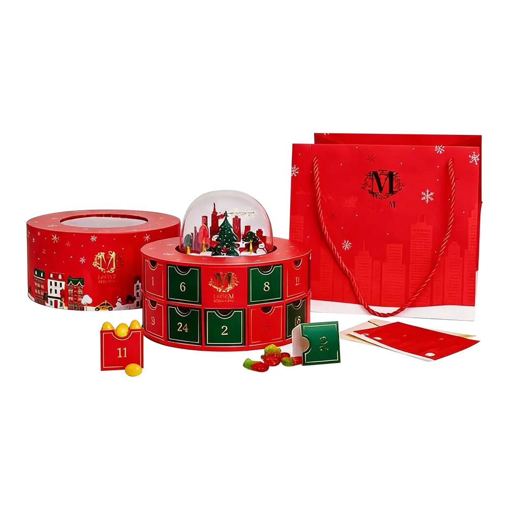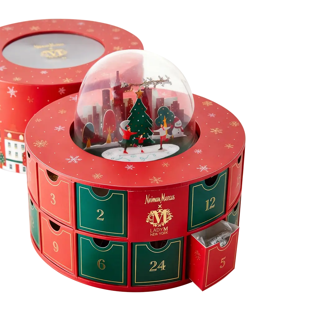 This complex multi-tiered rigid structure features a integrated central snow globe with a 3D laser-cut city skyline, evoking a sense of architectural wonder. We utilize precision die-cutting for the 24 individual sliding drawers, each accented with gold foil numbering for a tactile luxury feel. The circular, rotatable design ensures a dynamic unboxing journey, making it the ultimate premium packaging solution for luxury jewelry, beauty sets, or gourmet confections.