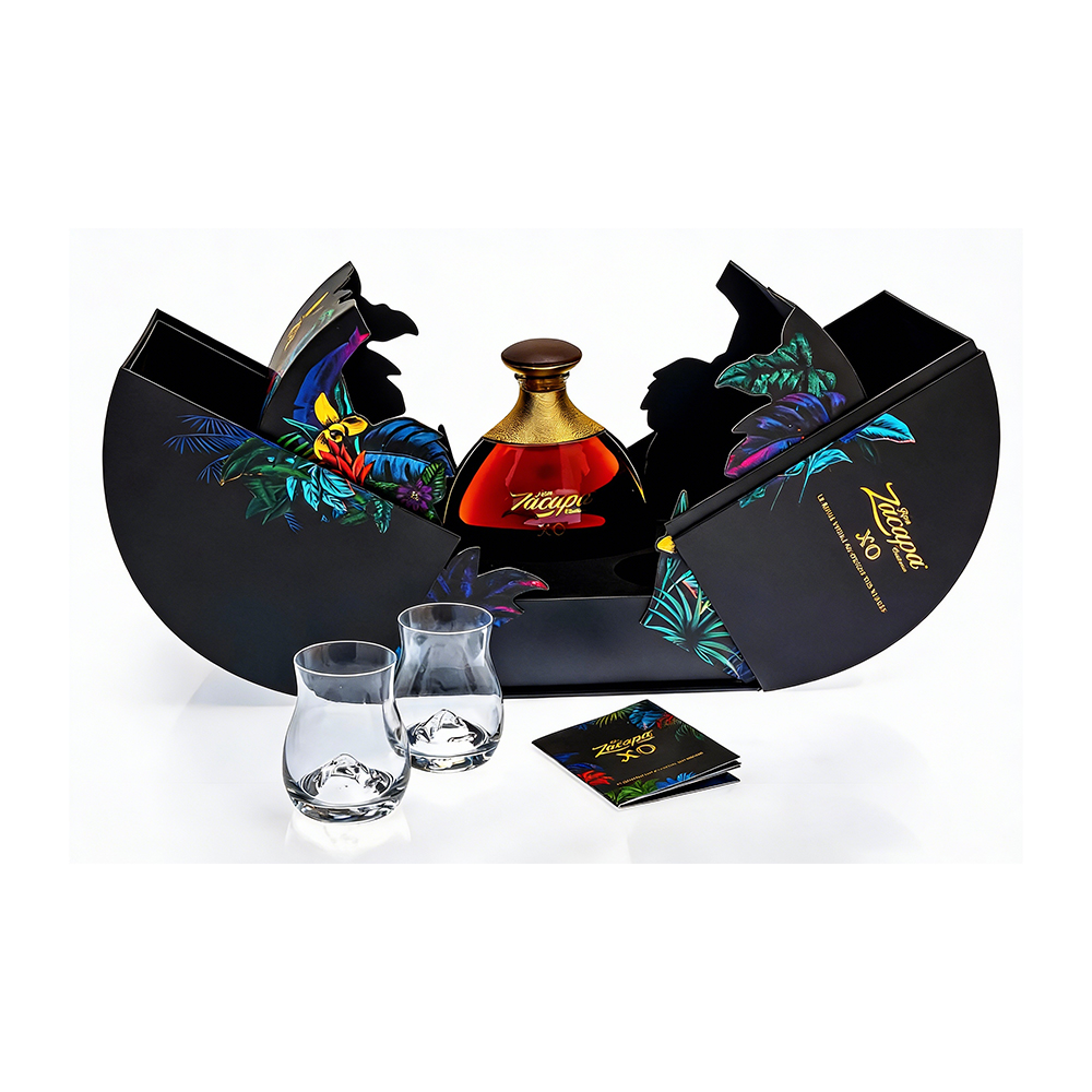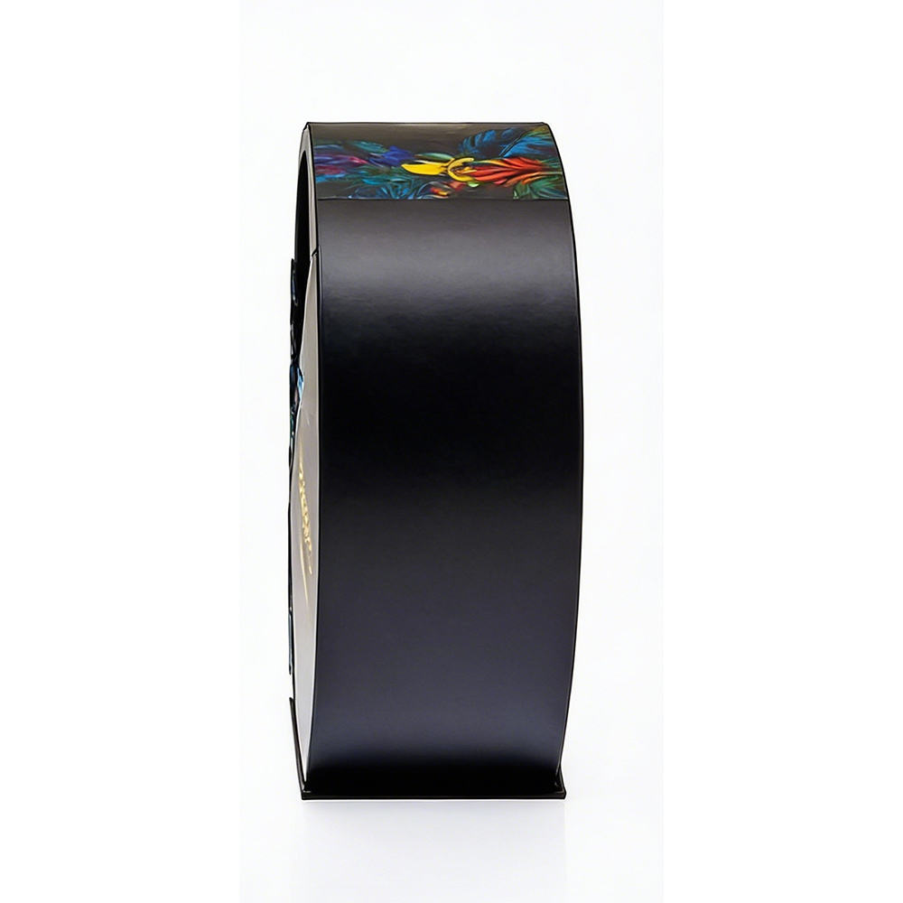 True luxury is not just seen; it is experienced. Our bespoke circular spirits packaging is designed to be a centerpiece, utilizing a unique multi-wing opening mechanism that unveils the product like a rare tropical flower. The deep obsidian base provides a dramatic stage for the vibrant botanical artwork, creating an immediate emotional resonance with connoisseurs of fine spirits.