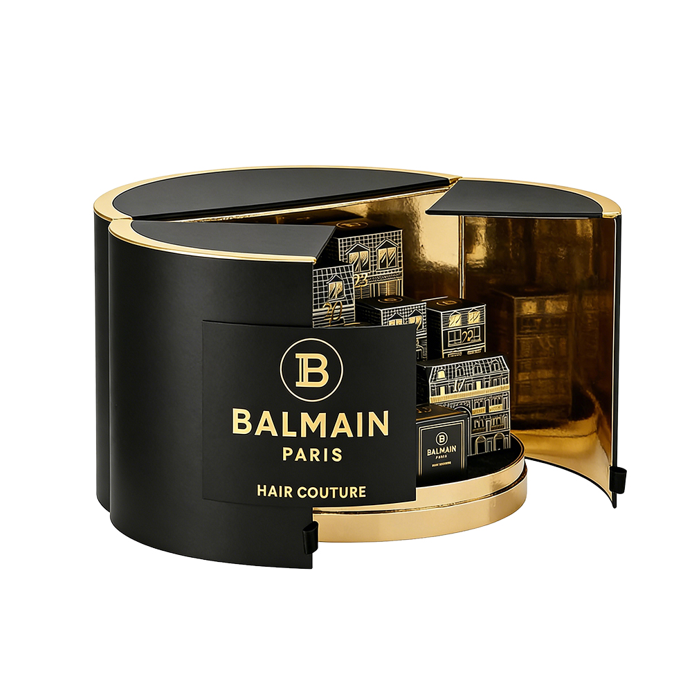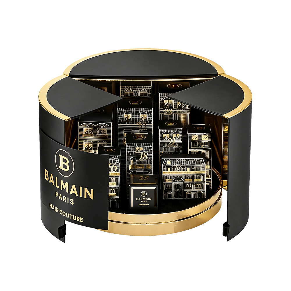 True luxury is not just seen; it is revealed. Our bespoke circular advent calendar is engineered as a rotating masterpiece, turning the traditional gift box into a theatrical unboxing experience. The deep noir finish serves as a sophisticated canvas for the shimmering gold metallic illustrations, creating a visual narrative of prestige and celebration.