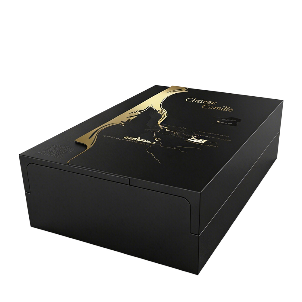 Luxury wine is more than a beverage; it is a legacy. Our bespoke wine gift box is engineered to serve as a theatrical stage for your brand’s finest bottles. The monochromatic noir exterior opens to reveal a symmetrical fold-out display, turning the act of opening into a memorable brand ceremony.