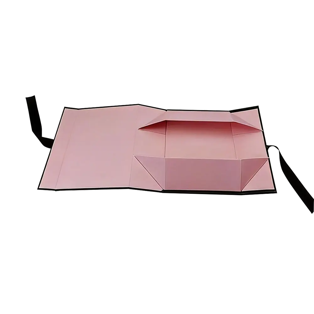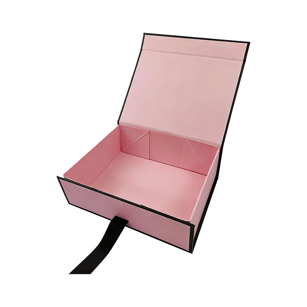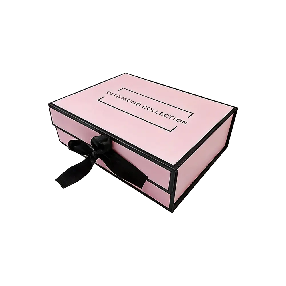 Packaging should be as sustainable as it is beautiful. Our bespoke pink gift box features a striking contrast-color design, where soft pink panels are defined by bold black bordering. This product moves away from traditional hardware, utilizing an integrated black silk ribbon to secure the box. The result is a clean, sophisticated look that prioritizes minimalist aesthetics and 100% material purity, perfect for luxury fashion and organic beauty brands.