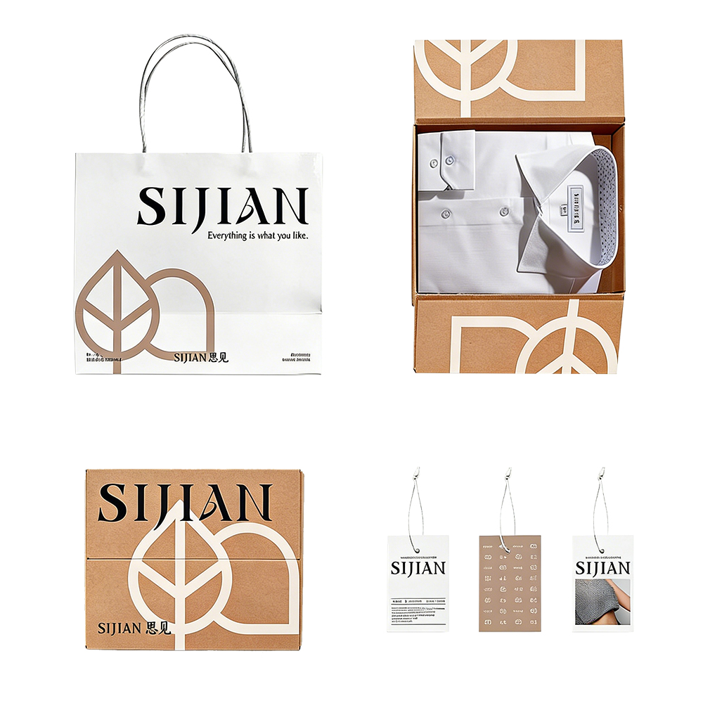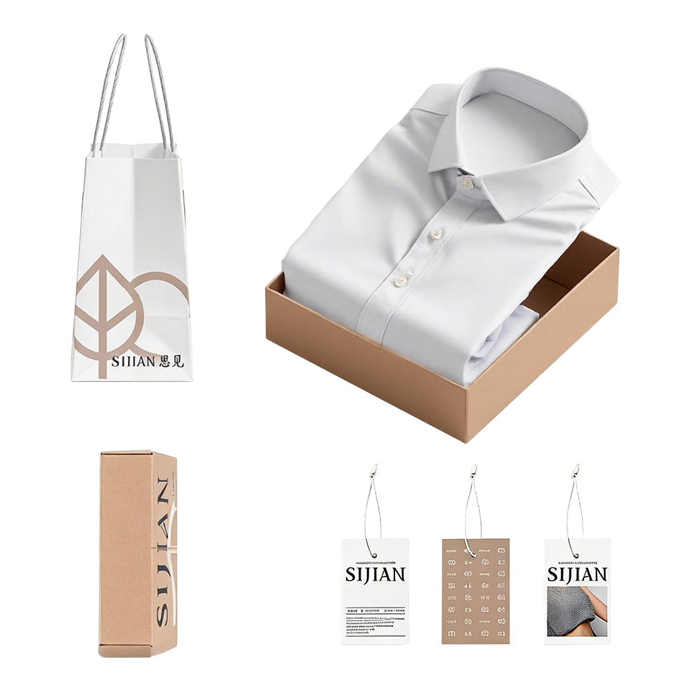 The set includes a heavy-duty rigid box specifically engineered for high-end shirts, featuring a custom-fit interior to ensure garments remain pristine during transit. The matching sustainable kraft paper bag is finished with integrated cotton handles for a velvet-like handfeel. Every component, from the die-cut hang tags to the box lid, is printed with high-definition offset lithography to ensure the logo's visual rhythm is perfectly preserved.