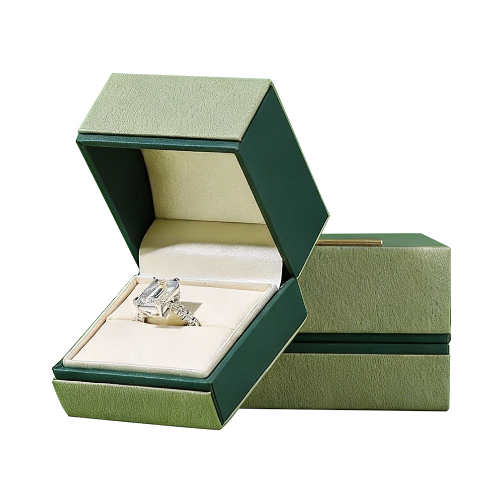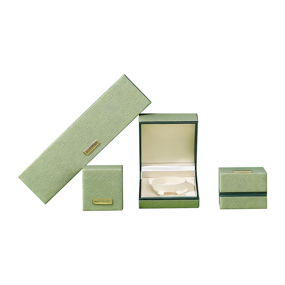 Crafted with a dual-tone green structure, these boxes feature a precision-engineered hinge mechanism for a smooth, high-end opening experience. The exterior is adorned with a brushed gold metallic plaque, adding a touch of architectural luxury. Inside, the premium cream velvet is meticulously fitted to provide both a soft-touch feel and structural protection for rings, earrings, and necklaces.