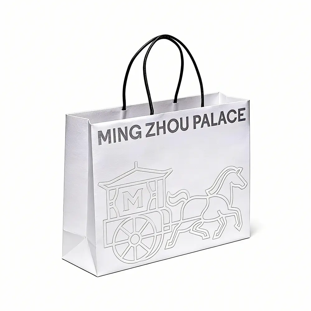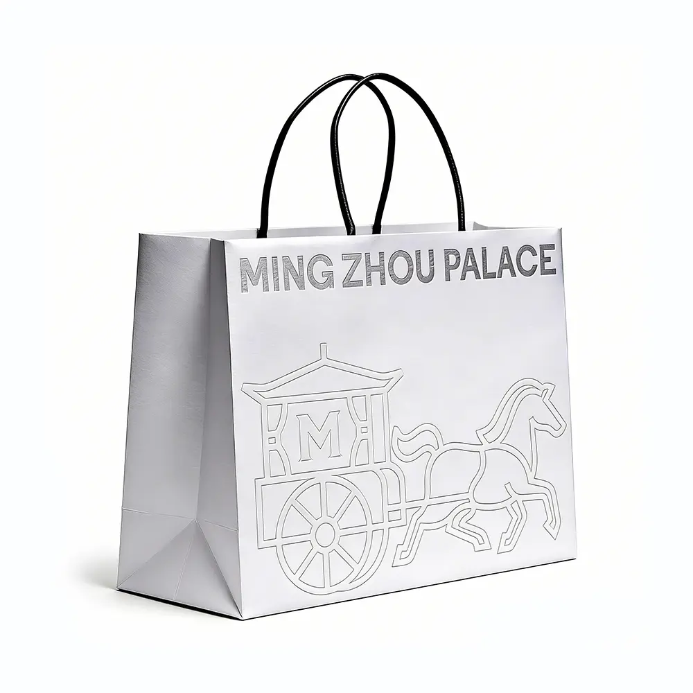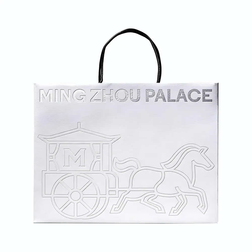 The first interaction a customer has with your brand is through its packaging. Our silver embossed paper bag is designed to evoke a sense of prestige and timeless elegance.