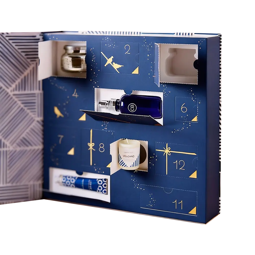 In the competitive beauty market, your packaging must command attention. Our Midnight Blue Stepped-Base Box moves away from traditional flat designs, utilizing a multi-level architectural silhouette to create a sense of pedestal-like prestige for your products. The 30° precision-angled edges and soft-touch matte finish offer a tactile experience that complements the visual depth of the gold foil branding.