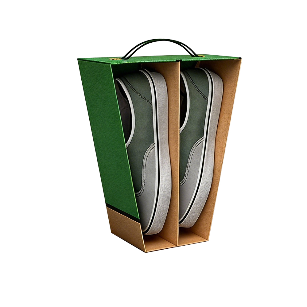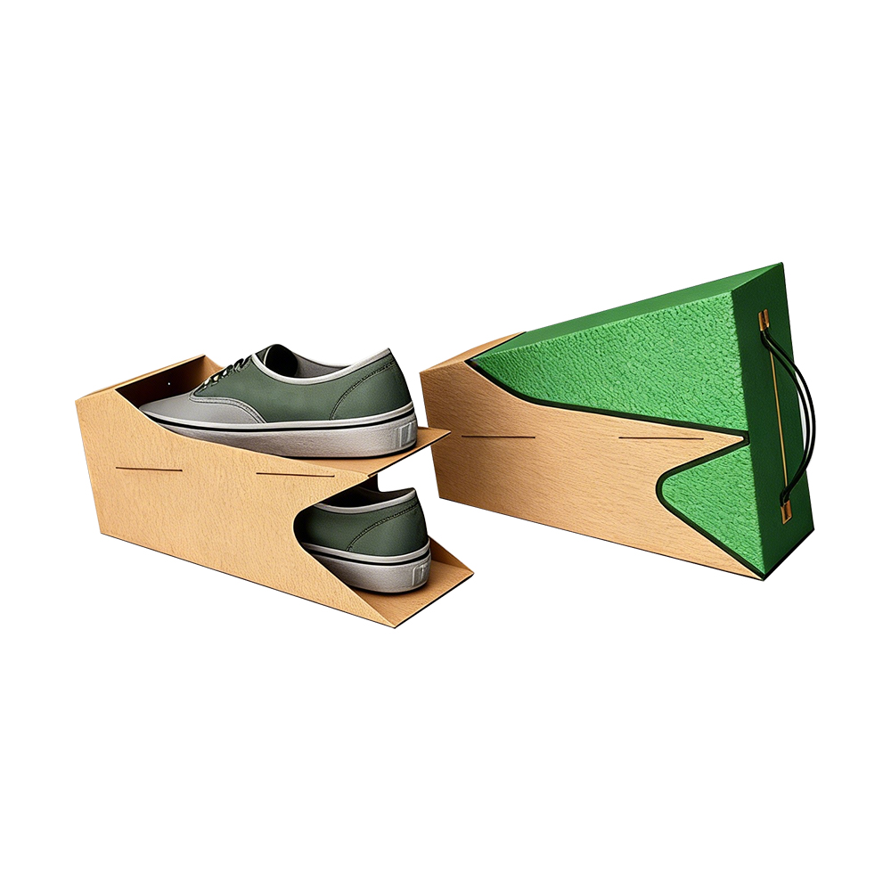 The brilliance of this design lies in its dual-layer internal architecture, allowing two shoes to be nested securely while minimizing the overall shipping volume. We utilize high-strength corrugated board and precision die-cutting to ensure the sharp, clean lines of the triangular form. The integrated cord handle adds a layer of convenience, transforming the box into a self-contained carrier that eliminates the need for extra plastic bags. The dual-tone green and kraft finish evokes a sense of industrial chic and organic reliability.